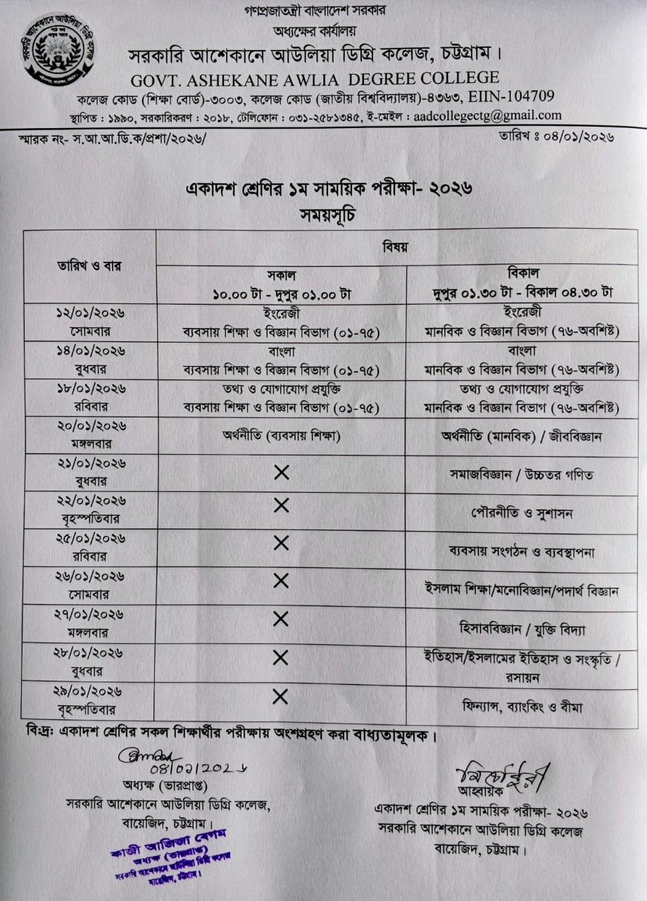 একাদশ শ্রেণির ১ম সাময়িক পরীক্ষার রুটিন ২০২৬ |